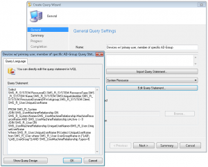 Jetzt wieder zurück zur Device Collection, in den Assistenten zum Erstellen einer Query Rule. Diesmal erstellen wir keine neue Abfrage, sondern importieren die gerade erstellte Query und der Assistent wirft diesmal keine Einwände dagegen.